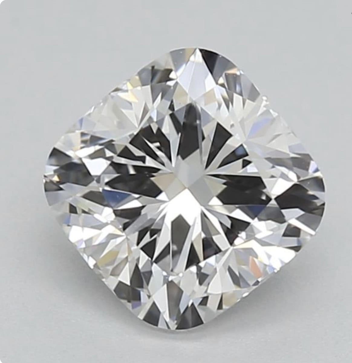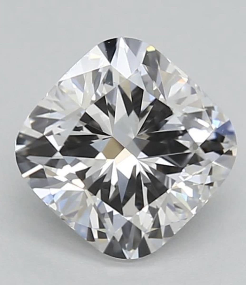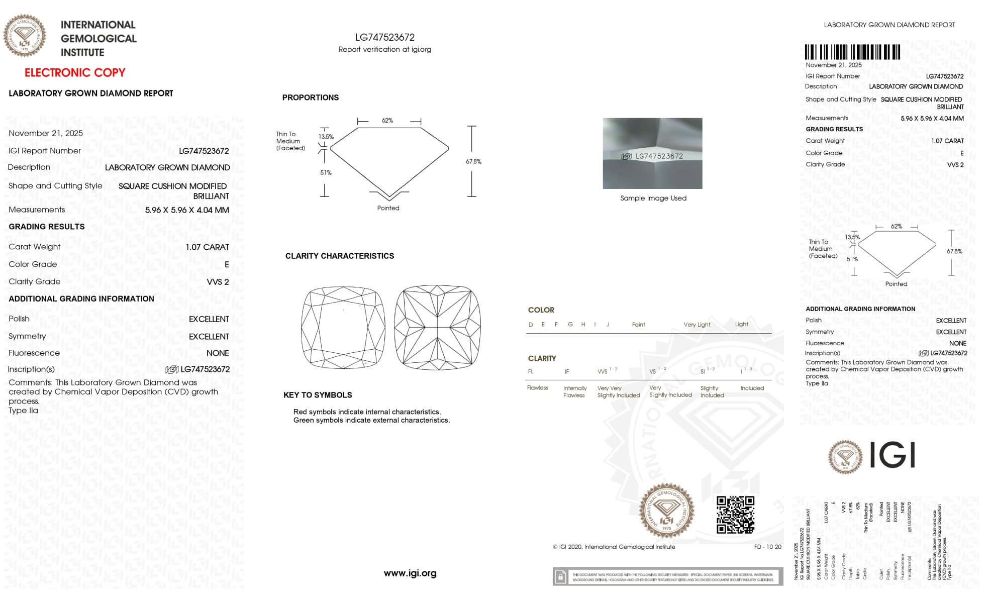 Laboratorijski diamant je teže 1.07 ct, E barve, VVS2 čistoče, dimenzije 5.96 * 5.96 * 4.04 mm in v obliki blazinice. Ocenjen je kot odličen (excellent) pri poliranju in simetriji.
