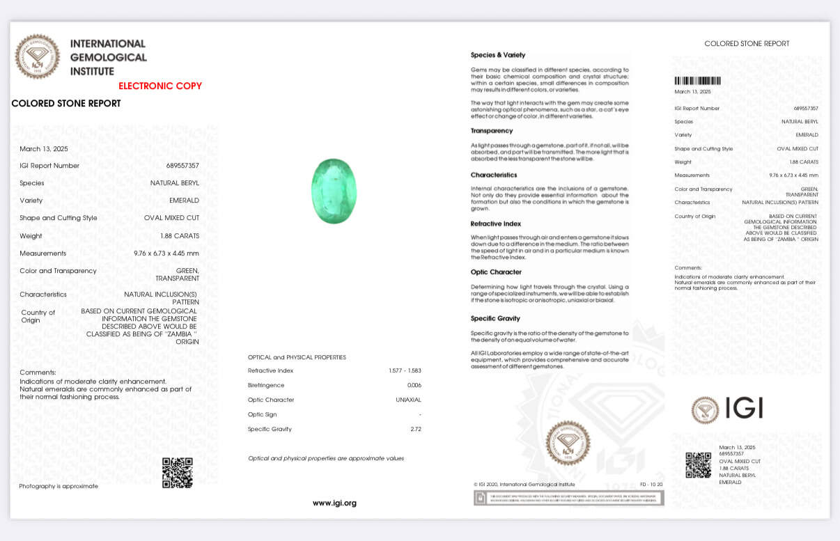 Naravni smaragd iz Zambije je teže 1.88 ct, dimenzije 9.76 * 6.73 * 4.45 mm in ovalne oblike. Je zelo lepo brušen, dokaj čist na oko in prekrasne zelene barve.