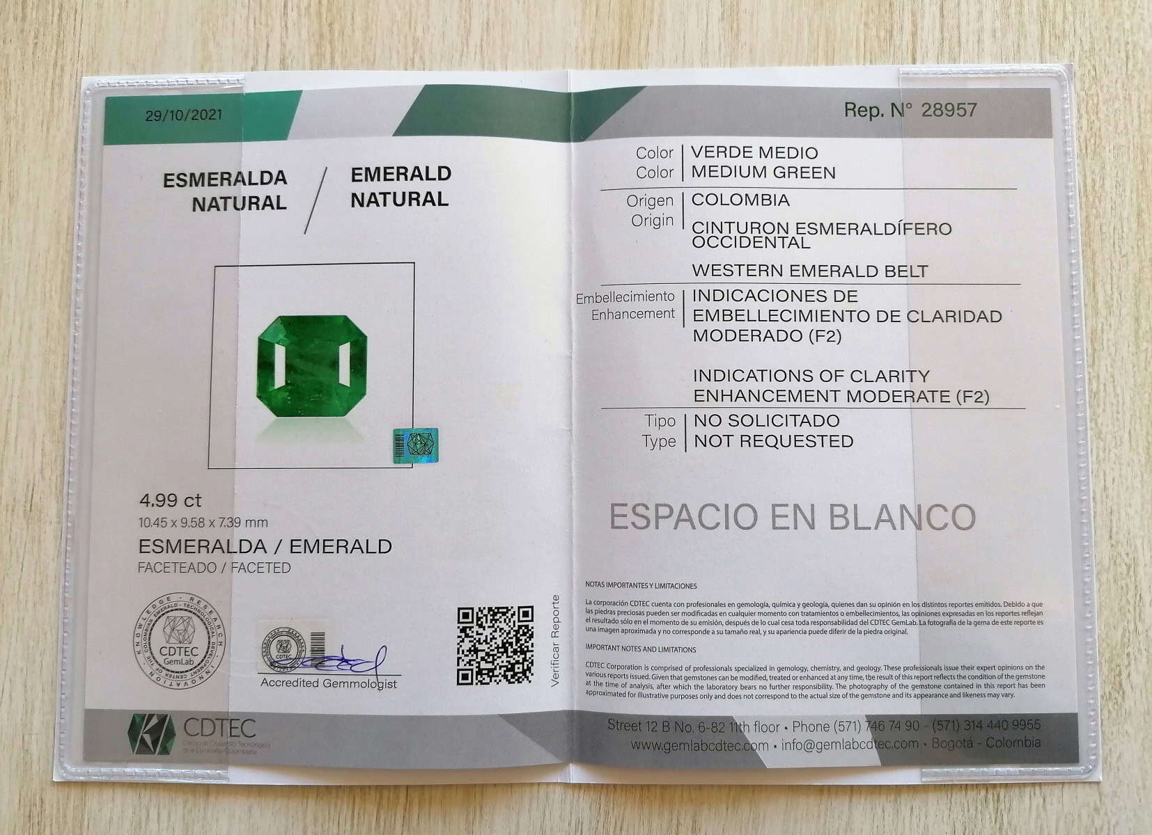 Naravni smaragd iz Kolumbije je teže 4.99 ct, dimenzije 10.45 * 9.58 * 7.39 mm in smaragde oblike. Je zelo lepo brušen, dokaj čist na oko in zelo lepe srednje zelene barve. Kamnu je priložen CDTEC certifikat, ki potrjuje njegovo avtentičnost.