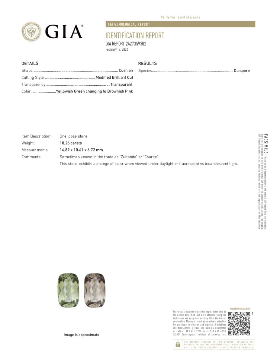 Sultanit je eden najredkejših kamnov na svetu, najdemo ga samo v Turčiji. Poseben je tudi zaradi tega, ker spreminja barvo pod različnimi izvori svetlobe – imenuje se tudi diaspor, ki spreminja barvo. Prva barva je rumenkasto zelena in se spremeni v rjavkasto rožnato. Je nesegrevan in netretiran, popolnoma čist na oko in zelo lepo brušen, poln ognja in sijaja.