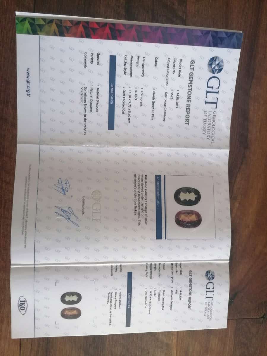 Sultanit je eden najredkejših kamnov na svetu, najdemo ga samo v Turčiji. Poseben je tudi zaradi tega, ker spreminja barvo pod različnimi izvori svetlobe – imenuje se tudi diaspor, ki spreminja barvo. Prva barva je modrikasto zelena in se spremeni v rožnato. Je nesegrevan in netretiran, popolnoma čist na oko in zelo lepo brušen, poln ognja in sijaja.